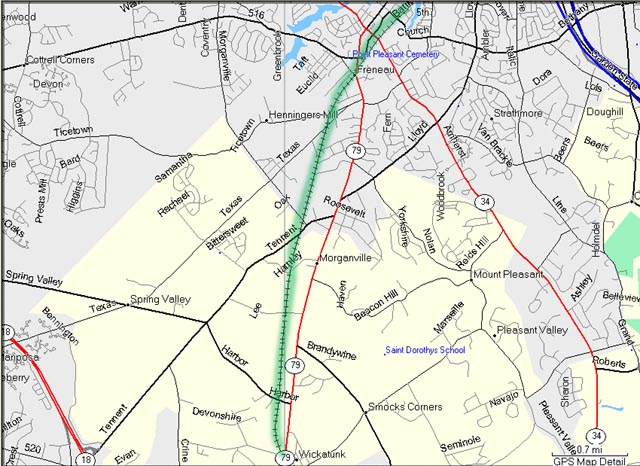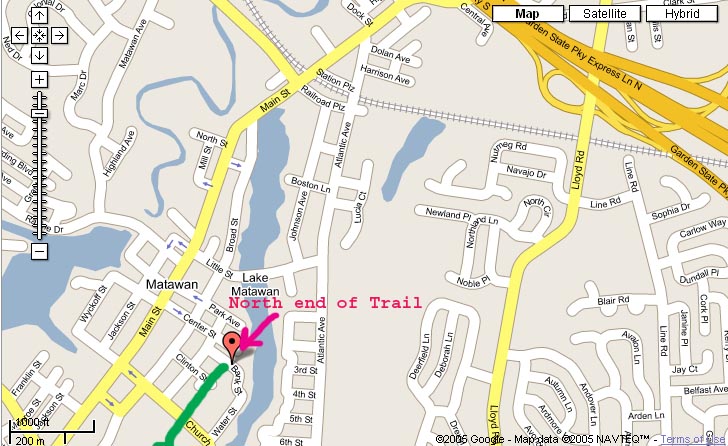 The north end of this segment ends on a residential street in the town of Matawan near several highways. There is no parking lot, but the streets have sidewalks and curbs. It looks OK to leave cars there.